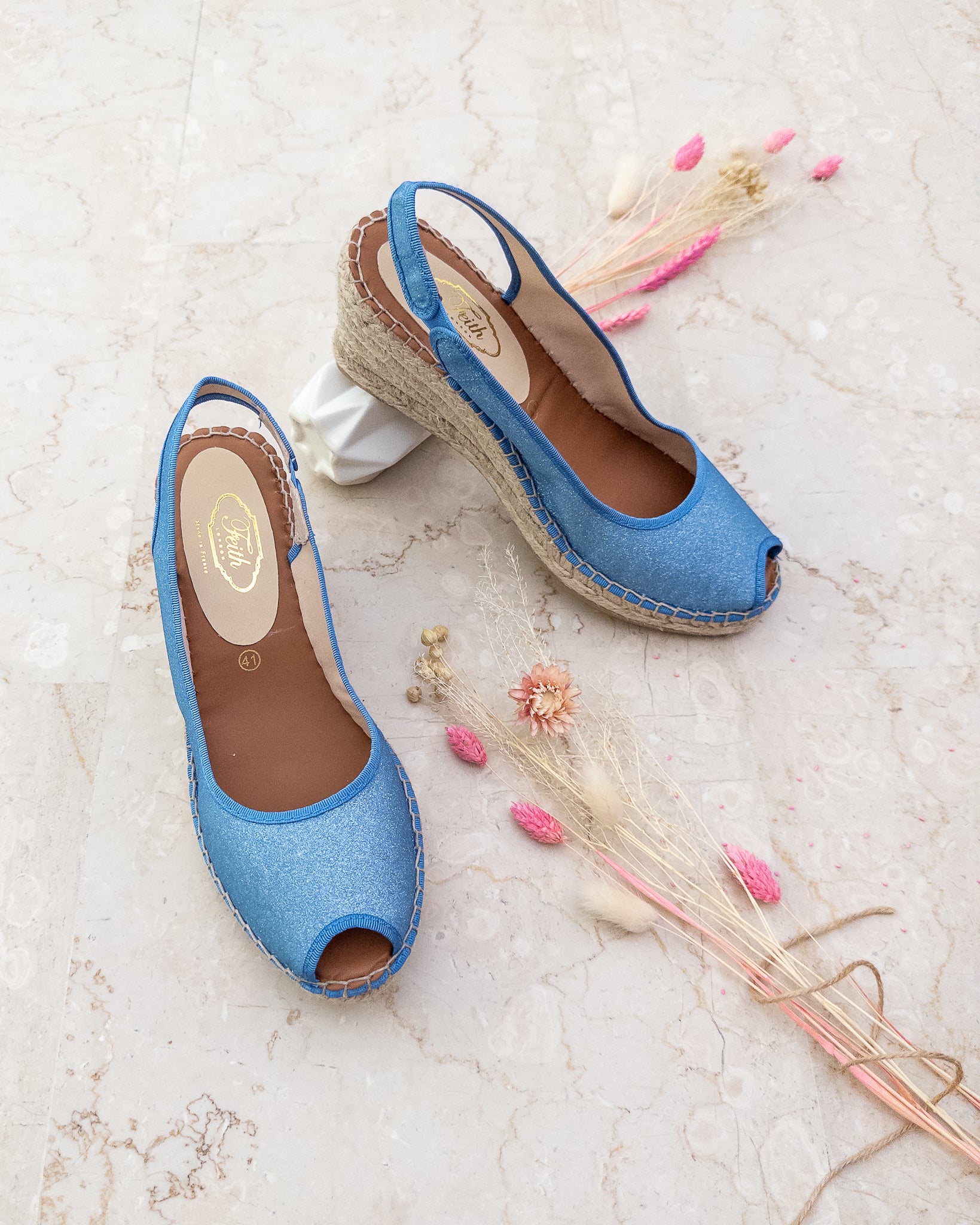 Glam it up in our comfy espadrille wedges in shimmer fabric. They are perfect for all weekends, pool parties and holidays! The sling-back strap has an elastic tab for flexibility and a rubber sole that makes it sturdy and secure for a long day out. Handmade in France.